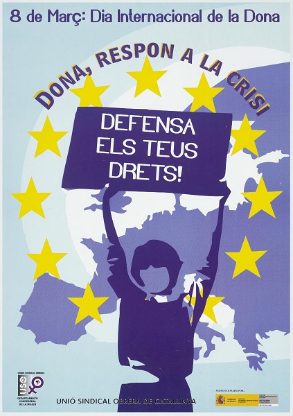 In this poster published by the Spanish Workers Trade Union for the International Women’s Day in 2021 - here in its Catalan version - the slogan and claim recall the economic crisis affecting Europe since 2008. The European circle of stars and the map of Europe in the background highlight the strong commitment for equal work opportunities between women and men promoted by the European Union.
