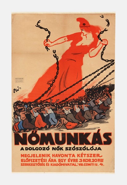 Hungarian artist Mihály Bíró designed a poster advertising for the socialist women’s journal The Woman Worker, representing a feminine figure symbolising the power of the working class. Red, strong and bearing the Phrygian hat, she symbolises freedom and revolution. She breaks the chains of a huge crowd of poor and exhausted women represented as enslaved.